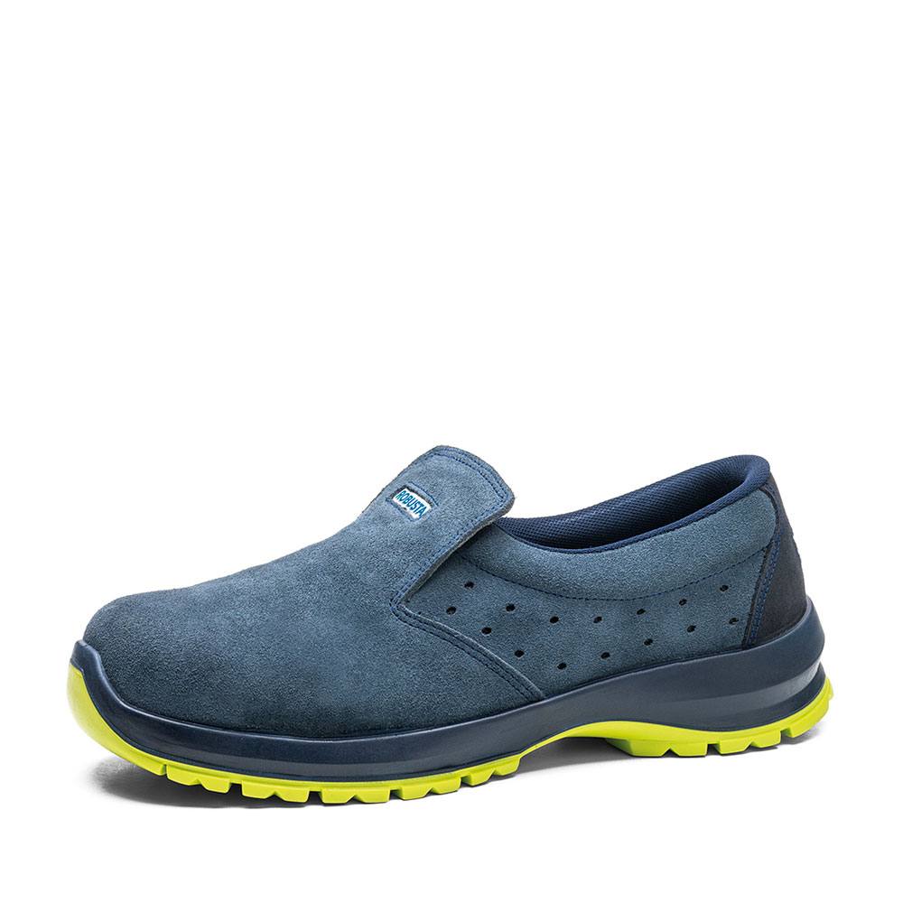 Zapato perforado de seguridad, cuello acolchado y lengüeta, con suela de poliuretano doble densidad.